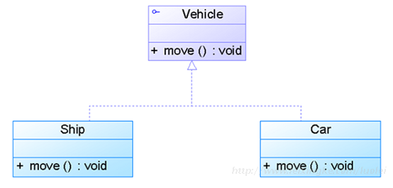 UML中表示:类与接口之间的实现关系用带空心三角形的虚线来表示。
