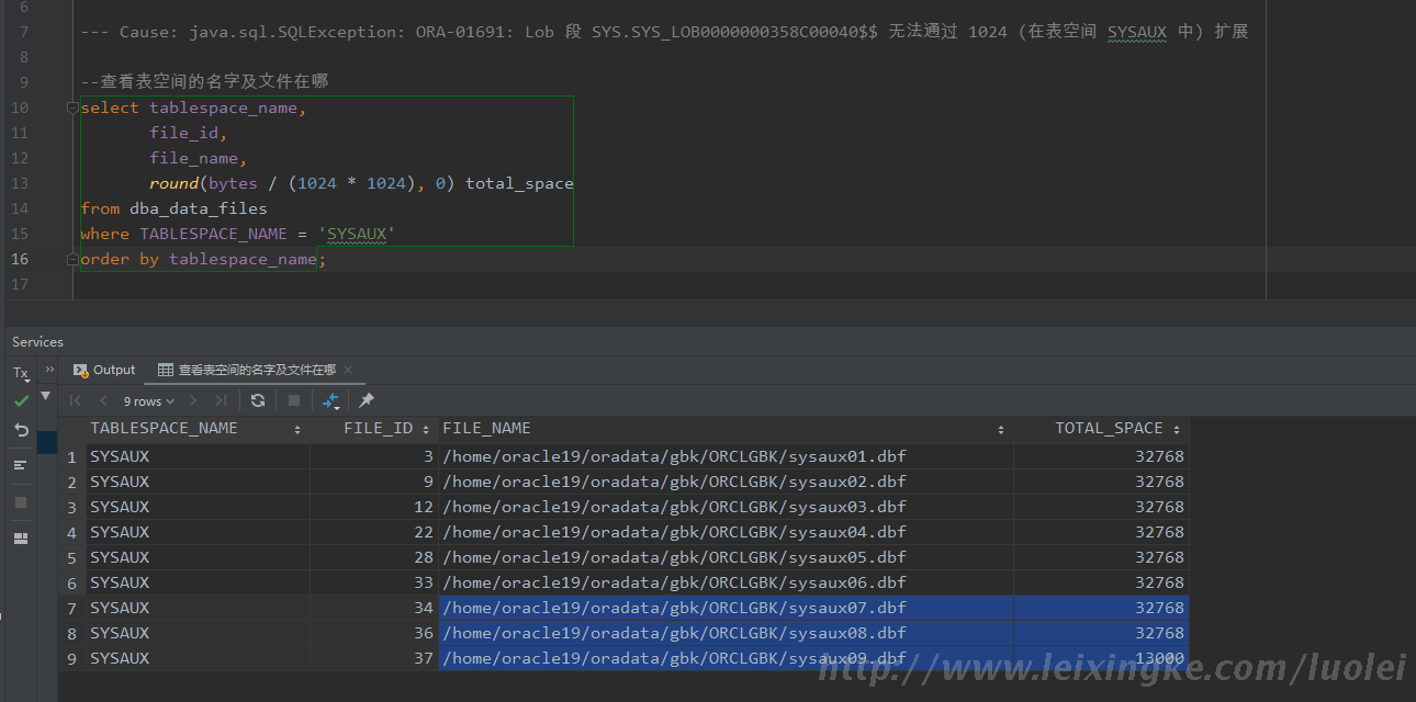 Cause: java.sql.SQLException: ORA-01691: Lob 段 SYS.SYS_LOB0000000358C00040$$ 无法通过 1024 (在表空间 SYSAUX 中) 扩展